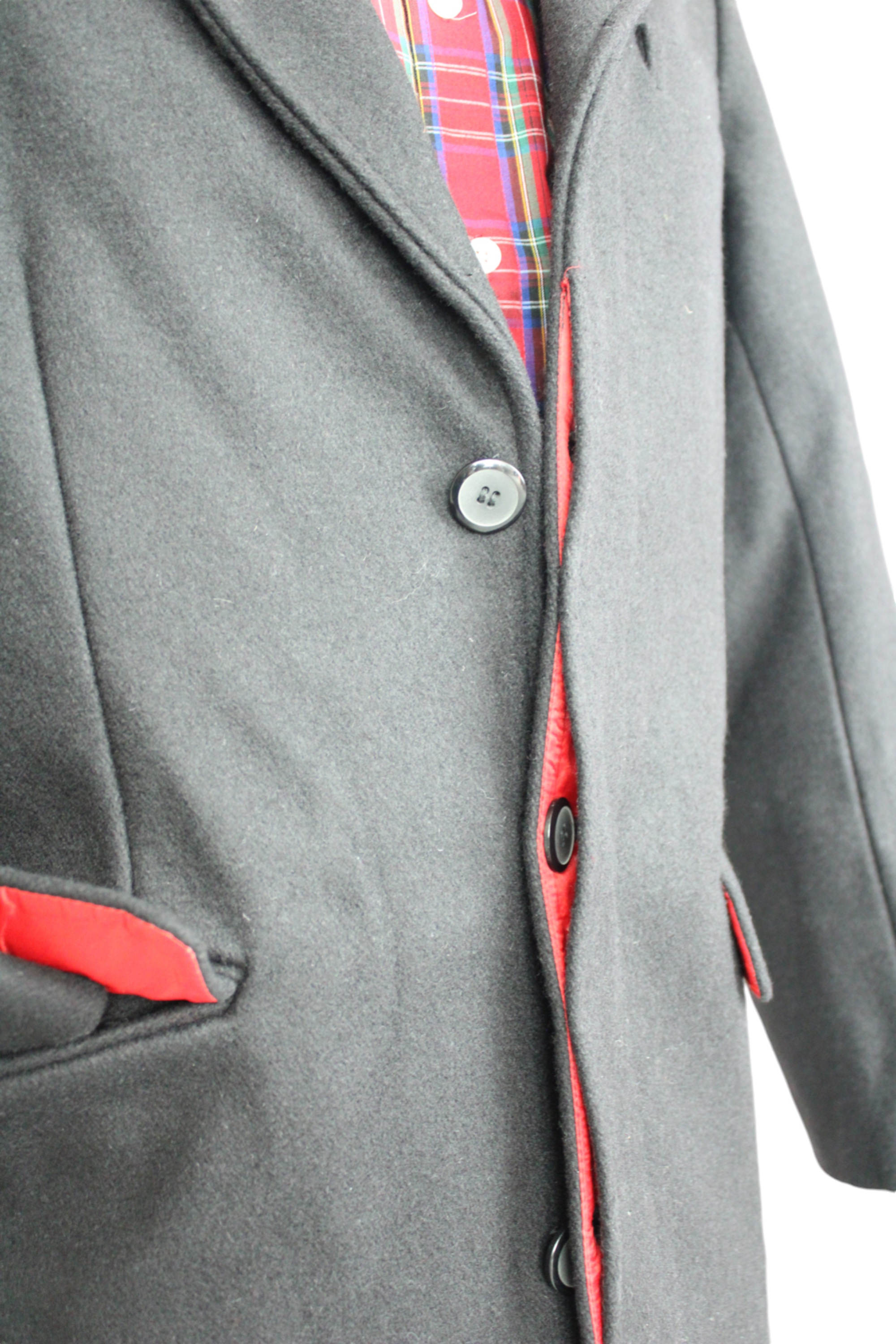 -Cappotto a 3/4 di lunghezza -100% lana -Fodera interna rossa -Bottoni a scomparsa sul davanti -Polsini a 4 bottoni -Spacco singolo su retro -Colore nero