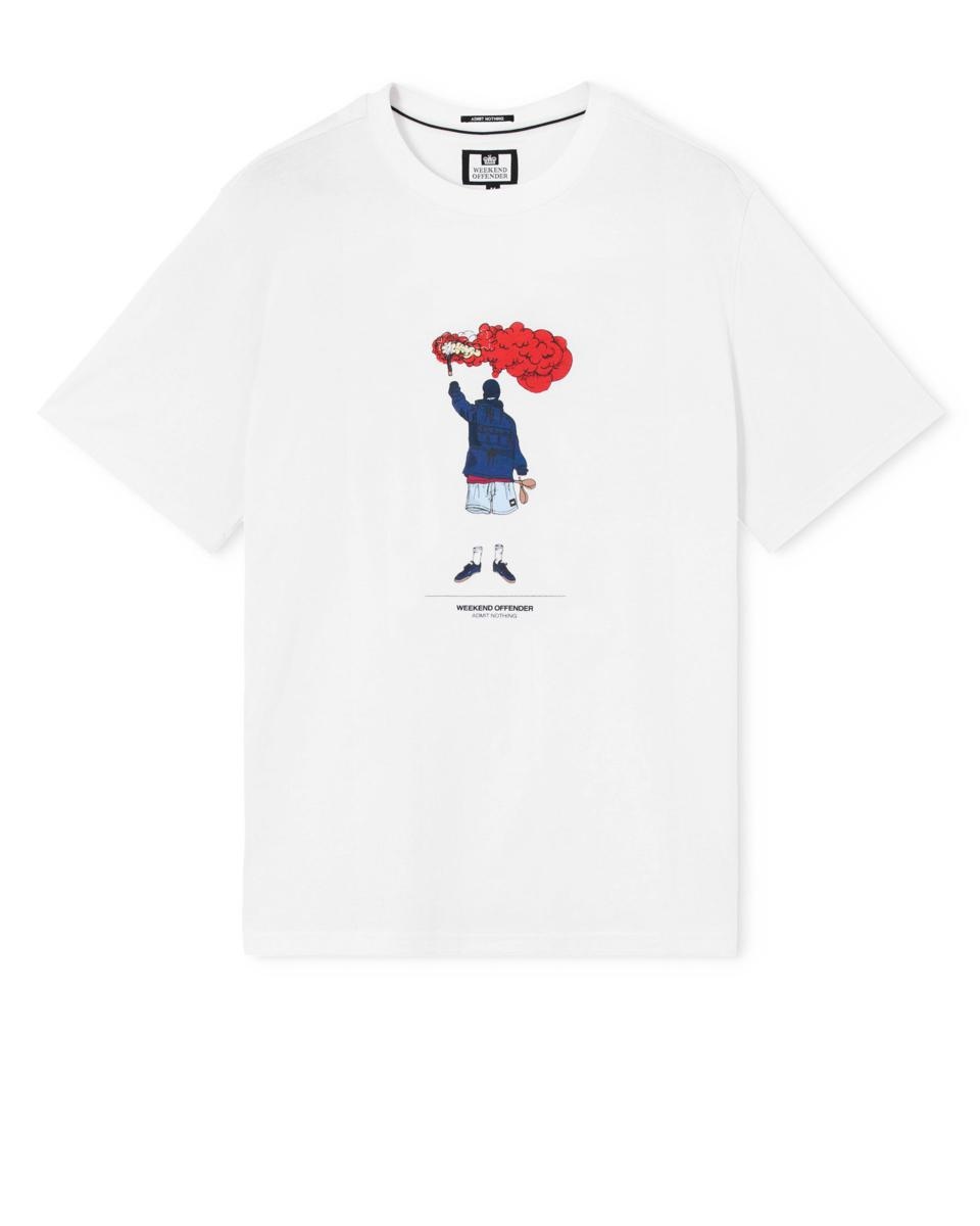 La Chabet Graphic Tee presenta una figura senza volto in completo abbigliamento Weekend Offender, flare in mano, fumo che si gonfia, tensione in aumento. Un tributo al dramma, alla sfida e allo spettacolo della cultura del giorno della partita.