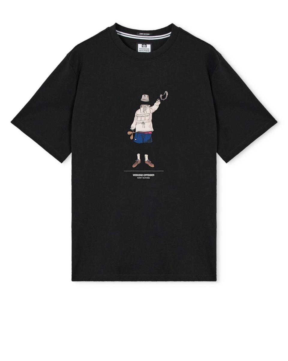La maglietta grafica Hassen presenta una grafica con stampa frontale di una figura senza testa in attrezzatura Weekend Offender completa, con un cappello a secchiello galleggiante, tamburello in mano. Un cenno alla musica e allo stile della terrazza.